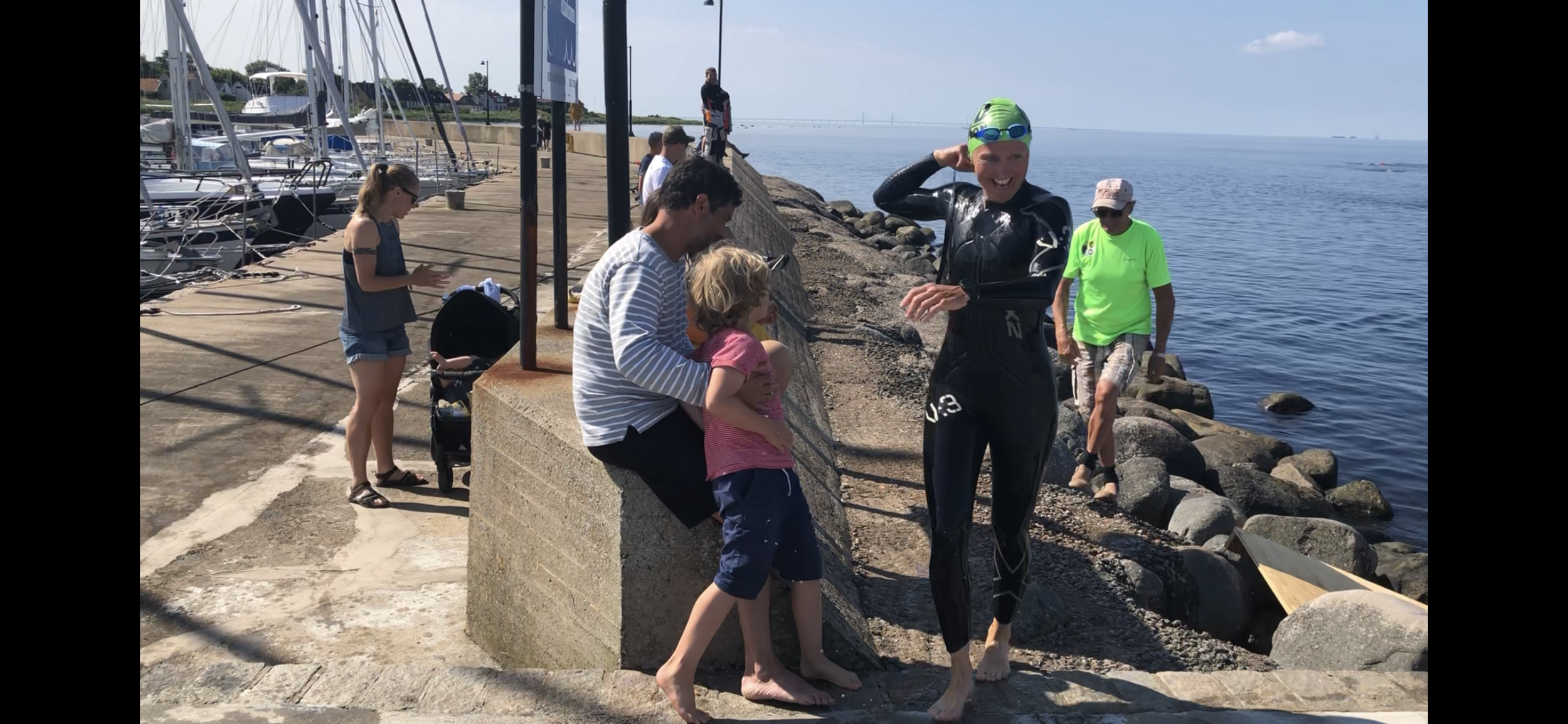 Vi startar i vattnet och ger oss ut på en varvbana Motsols där vi kan se botten hela tiden. Publiken får lätt att följa oss och vi har nära till en av säkerhetsbåtarna hela tiden. Efter avslutad distans tar vi oss upp på piren för en kort löpning till T2.